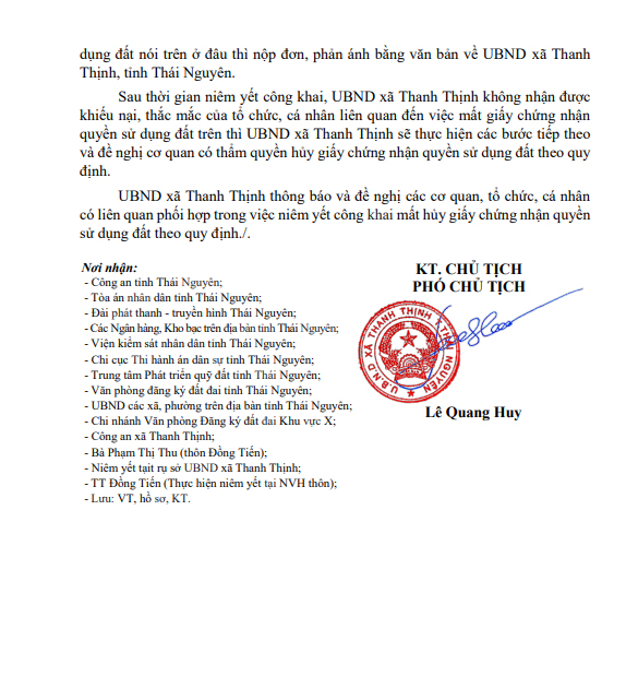 Thông báo Niêm yết công khai về việc mất Giấy chứng nhận quyền sử dụng đất của bà Hoàng Thị Eng, địa chỉ tại xóm Hiệp Hòa, xã Hợp Thành