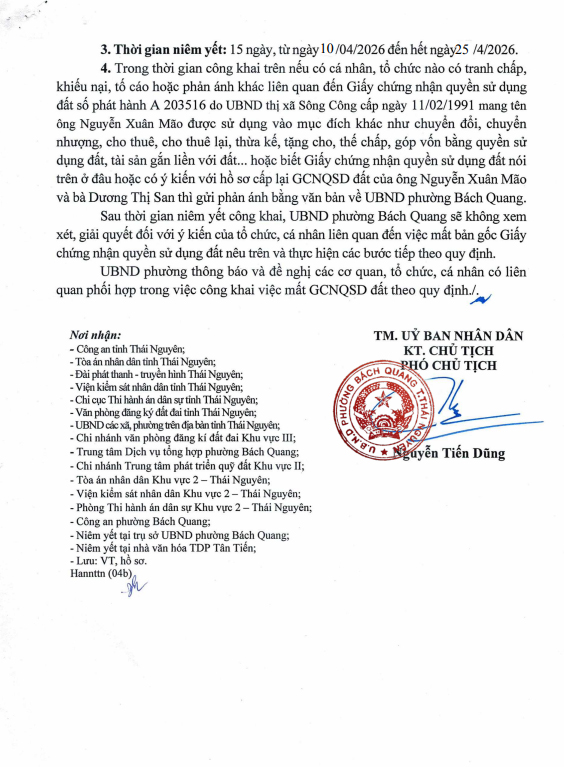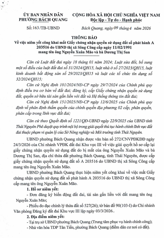 Thông báo về việc niêm yết công khai mất Giấy chứng nhận quyền sử dụng đất số phát hành A 203516 do UBND thị xã Sông Công cấp ngày 11/02/1991 mang tên ông Nguyễn Xuân Mão và bà Dương Thị San