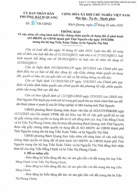 Thông báo về việc niêm yết công khai mất Giấy chứng nhận quyền sử dụng đất số phát hành AO 486391 do UBND thành phố Thái Nguyên cấp ngày 19/5/2006 mang tên hộ ông Trần Xuân Thắm và bà Nguyễn Thị Nhã