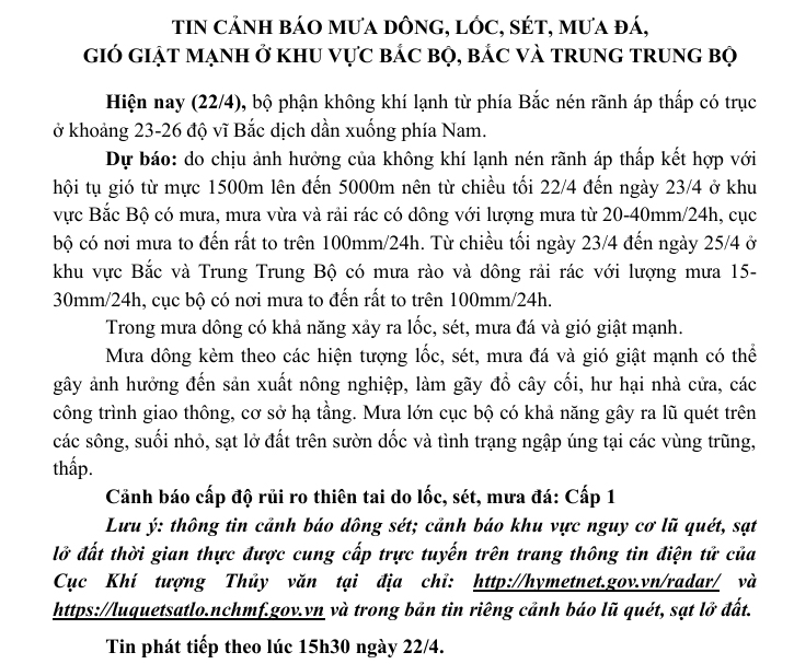 TIN CẢNH BÁO MƯA DÔNG, LỐC, SÉT, MƯA ĐÁ, GIÓ GIẬT MẠNH Ở KHU VỰC BẮC BỘ, BẮC VÀ TRUNG TRUNG BỘ