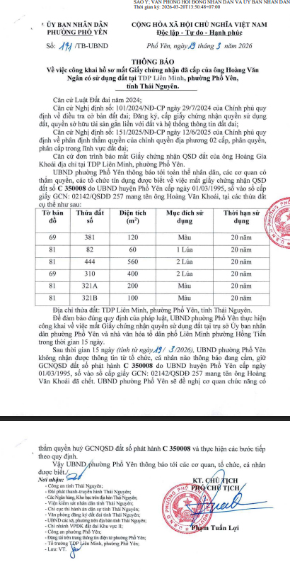 Về việc công khai hồ sơ mất Giấy chứng nhận đã cấp của ông Hoàng Văn Ngân có sử dụng đất tại TDP Liên Minh, phường Phố Yên, tỉnh Thái Nguyên.
