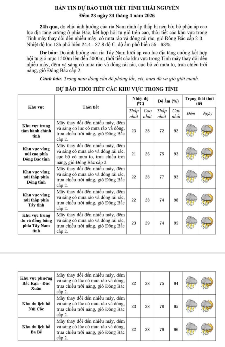 BẢN TIN DỰ BÁO THỜI TIẾT TỈNH THÁI NGUYÊN Đêm 23 ngày 24 tháng 4 năm 2026