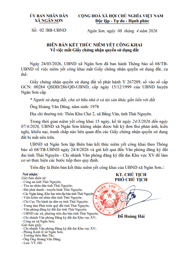 BIÊN BẢN KẾT THÚC NIÊM YẾT CÔNG KHAI Về việc mất Giấy chứng nhận quyền sử dụng đất
