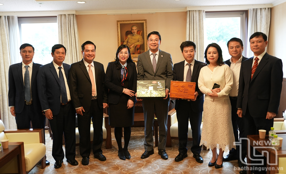 Đồng chí Nguyễn Thanh Hải, Ủy viên Trung ương Đảng, Bí thư Tỉnh ủy, Trưởng Đoàn ĐBQH tỉnh Thái Nguyên và Đoàn công tác tặng quà lưu niệm cho Đại sứ quán Việt Nam tại Nhật Bản.
