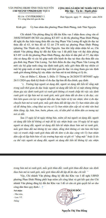 Về việc niêm yết công khai ranh giới, mốc giới thửa đất của bà Nguyễn Thị Hồng Nhung