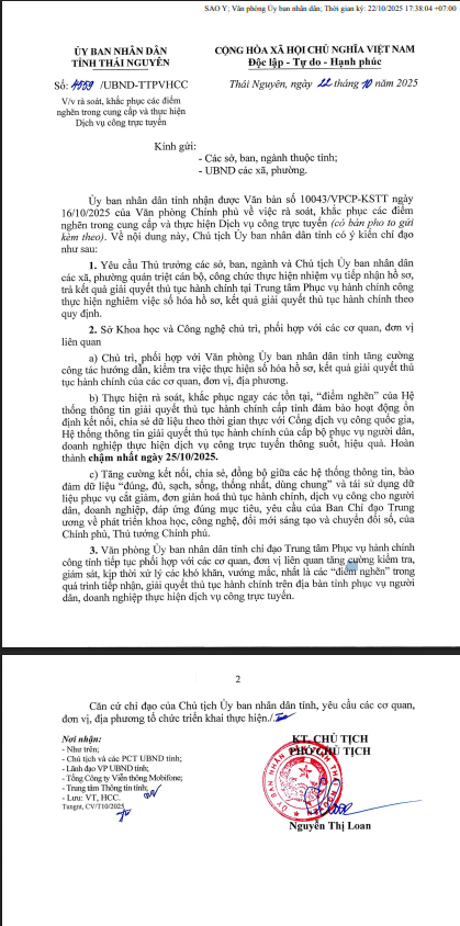 Ngày 22/10/2025, UBND tỉnh ban hành Công văn số 4559/UBND-TTPVHCC về việc rà soát, khắc phục các điểm nghẽn trong cung cấp và thực hiện Dịch vụ công trực tuyến.