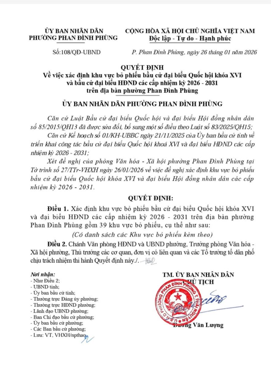 DANH SÁCH Các khu vực bỏ phiếu bầu cử đại biểu Quốc hội khoá XVI và đại biểu Hội đồng nhân dân các cấp nhiệm kỳ 2026 - 2031 trên địa bàn phường Phan Đình Phùng (Kèm theo Quyết định số 108/QĐ-UBND ngày 26/01/2026 của UBND phường Phan Đình Phùng)