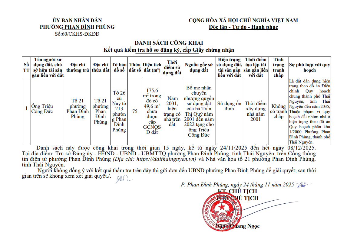 Danh sách công khai đăng ký đất đai, cấp GCNQSD đất ông Triệu Công Đức