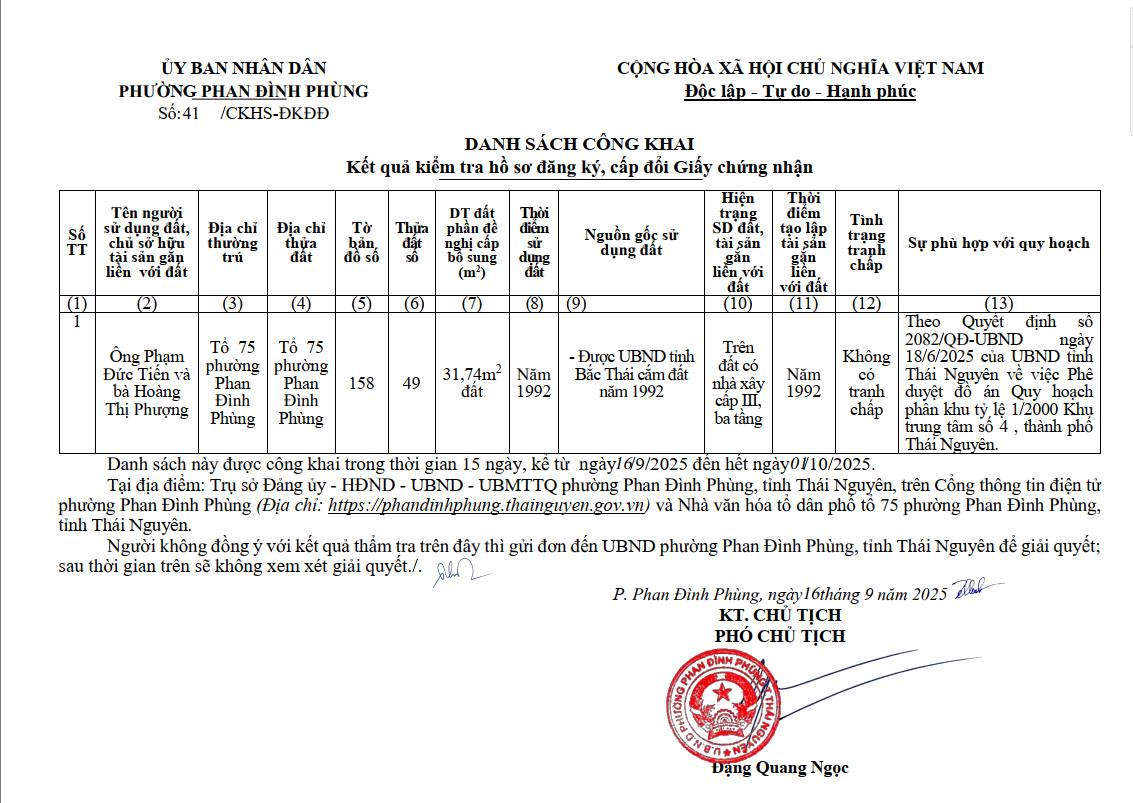 Danh sách công khai: Kết quả hồ sơ đăng ký, cấp đổi giấy chứng nhận (Ông Phạm Đức Tiến và bà Hoàng Thị Phượng)