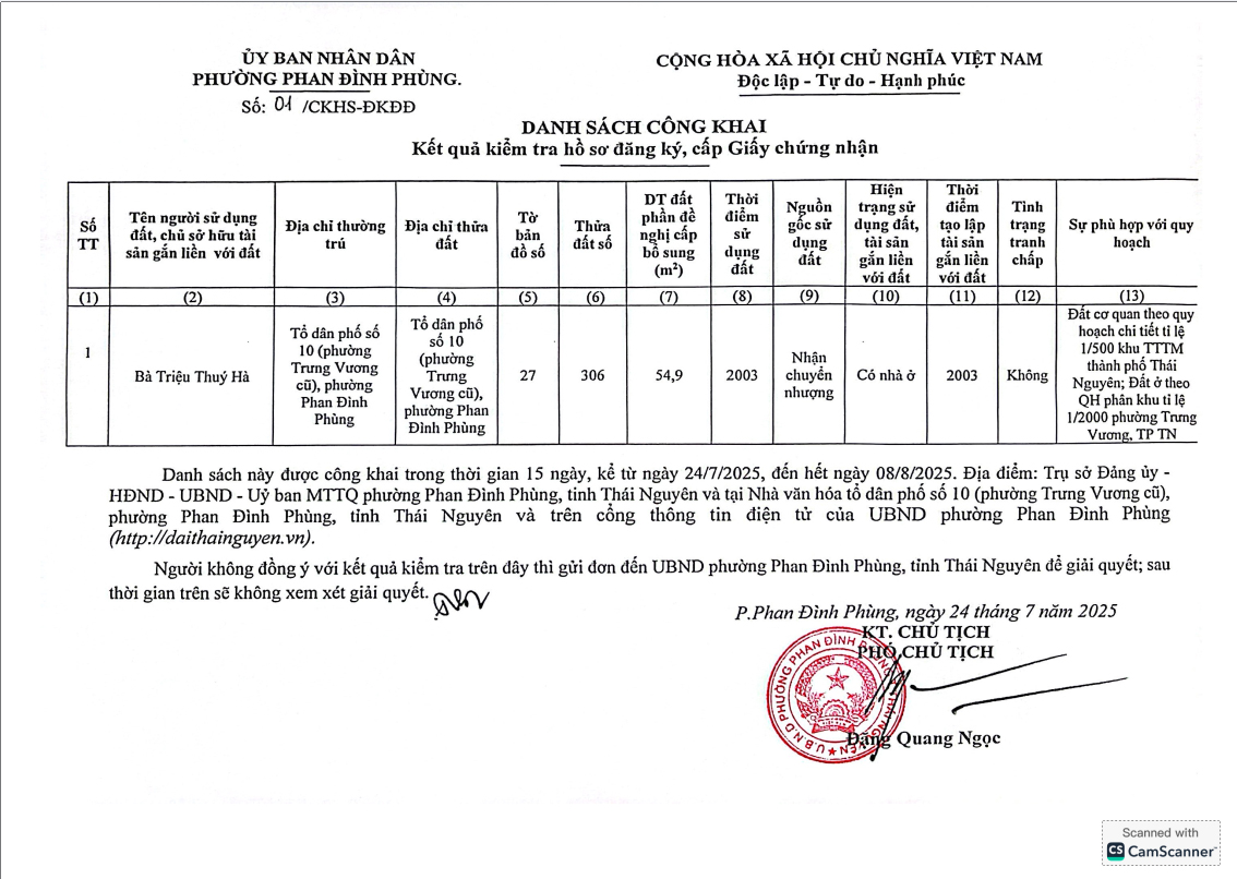 DANH SÁCH CÔNG KHAI KẾT QUẢ KIỂM TRA HỒ SƠ ĐĂNG KÝ, CẤP GIẤY CHỨNG NHẬN