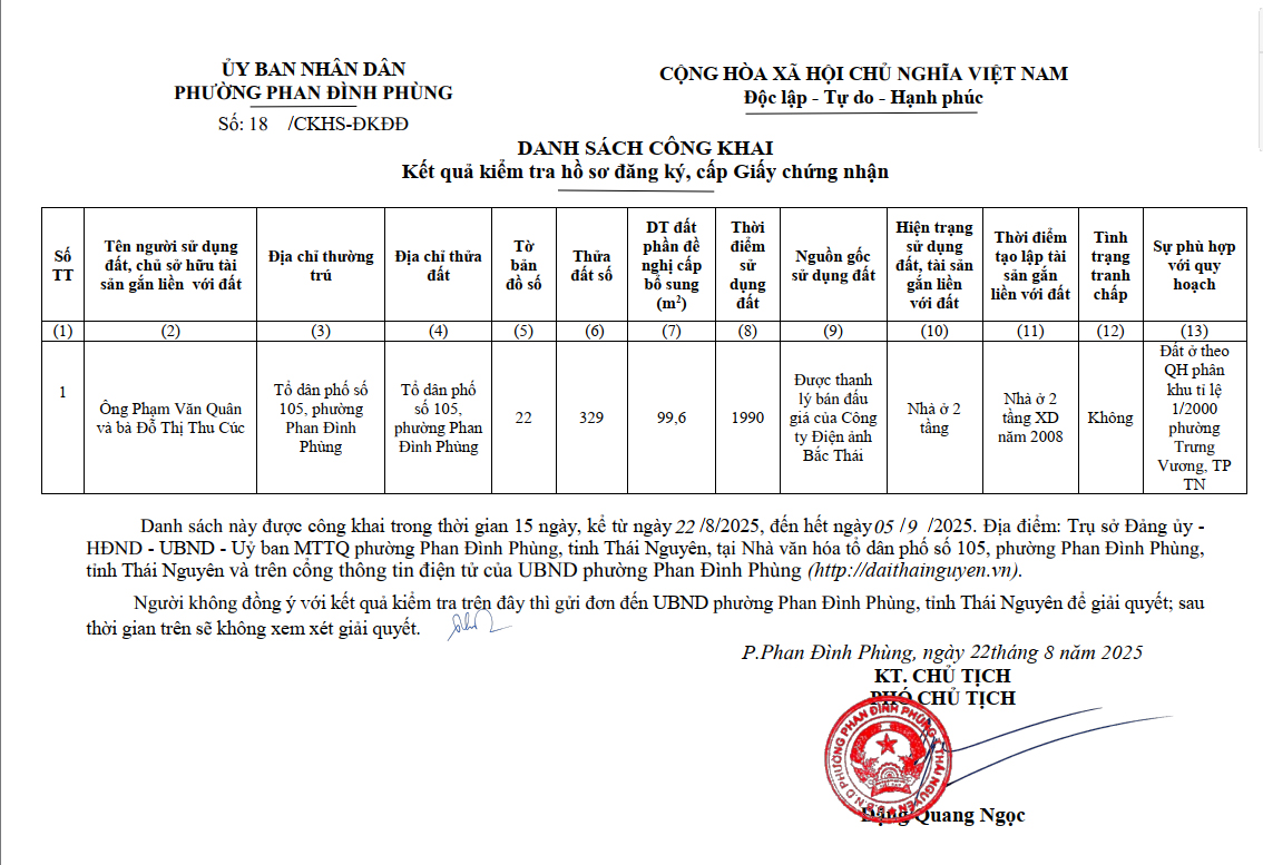 DANH SÁCH CÔNG KHAI KẾT QUẢ KIỂM TRA HỒ SƠ ĐĂNG KÝ, CẤP GIẤY CHỨNG NHẬN