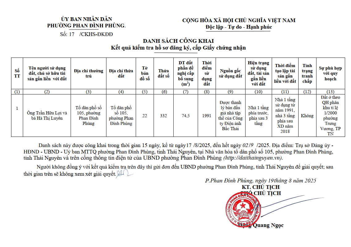 DANH SÁCH CÔNG KHAI KẾT QUẢ KIỂM TRA HỒ SƠ ĐĂNG KÝ, CẤP GIẤY CHỨNG NHẬN