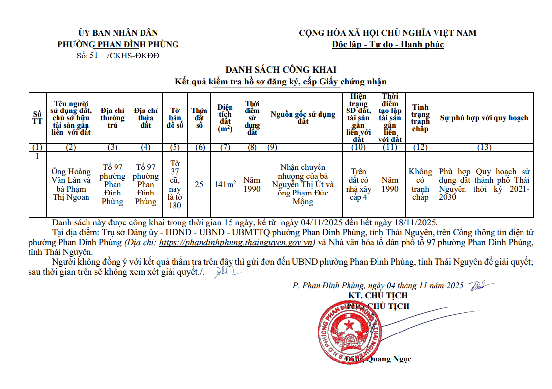 Danh sách công khai đăng ký đất đai, cấp GCNQSD đất ông Trần Ngọc Thụ