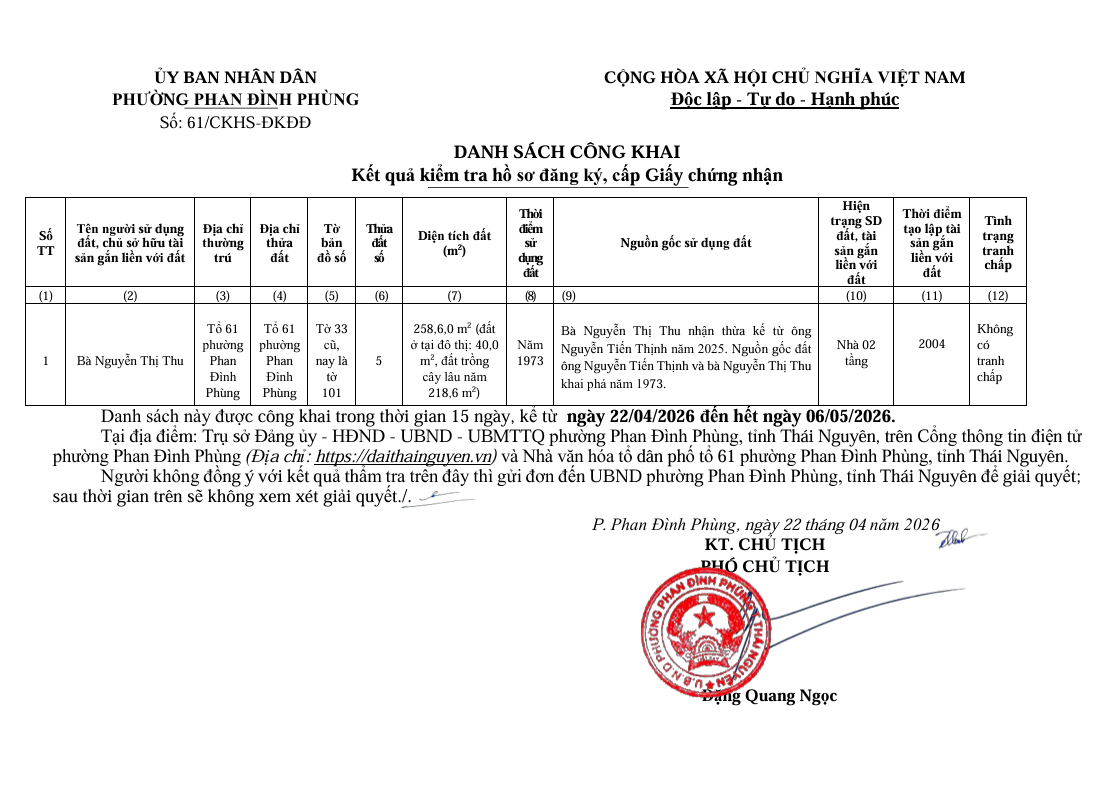 DANH SÁCH CÔNG KHAI Kết quả kiểm tra hồ sơ đăng ký, cấp Giấy chứng nhận ông Hoàng Văn Thái tổ 91