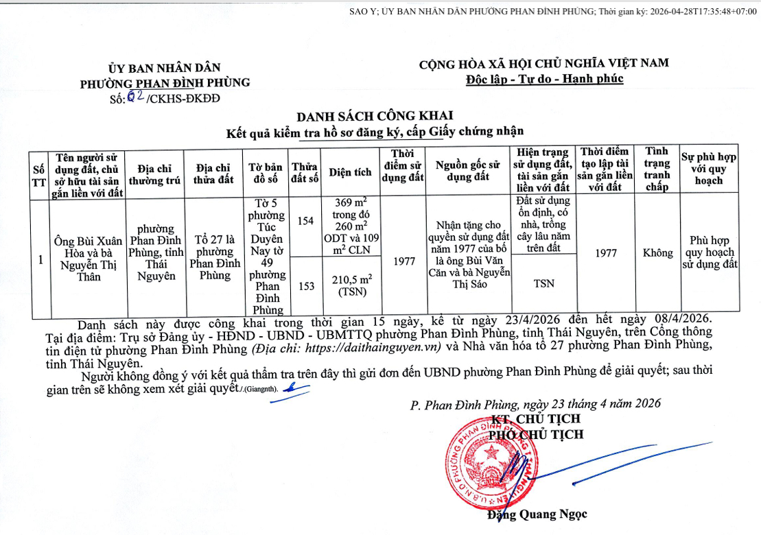 DANH SÁCH CÔNG KHAI Kết quả kiểm tra hồ sơ đăng ký, cấp Giấy chứng nhận (Bùi Xuân Hòa)