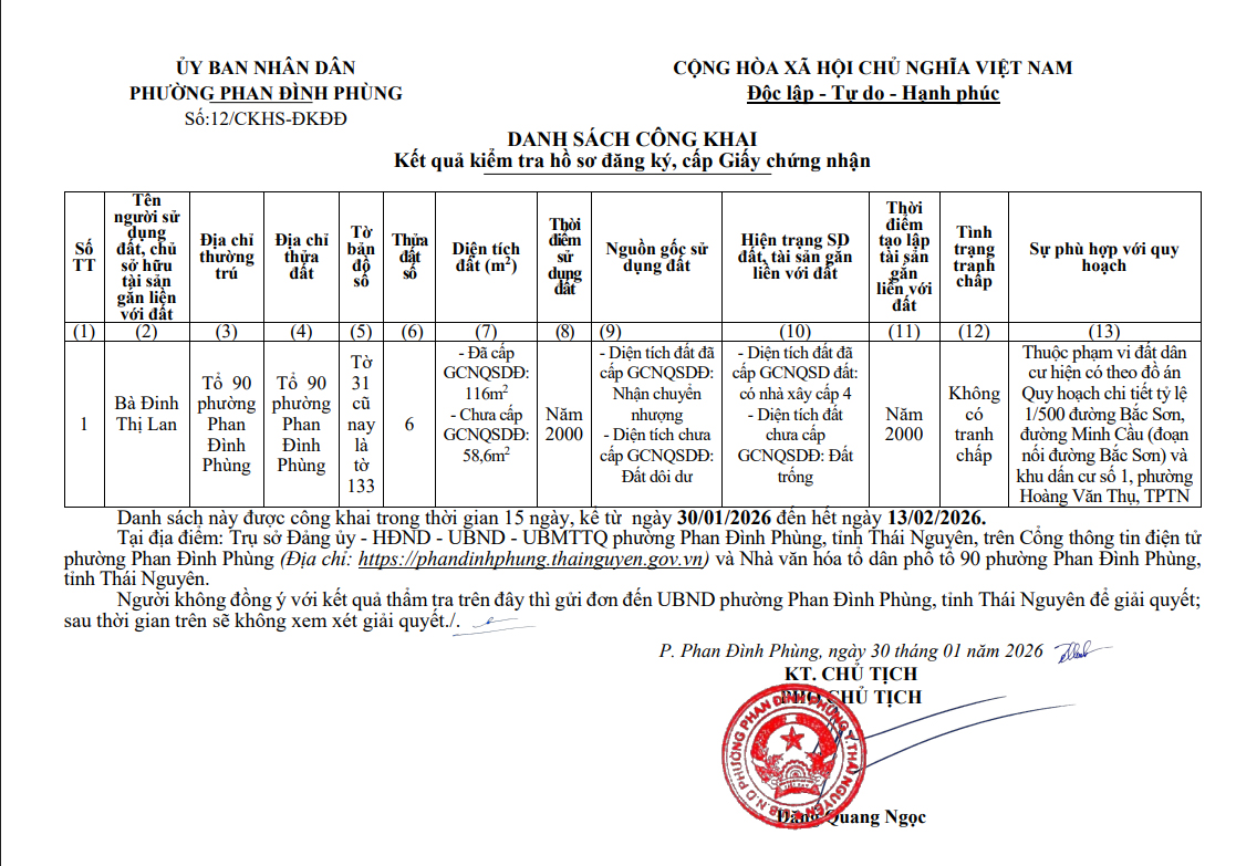 DANH SÁCH CÔNG KHAI Kết quả kiểm tra hồ sơ đăng ký, cấp Giấy chứng nhận Đinh Thị Lan