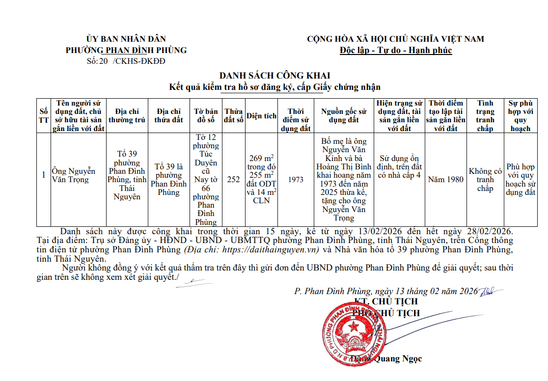 CÔNG KHAI DANH SÁCH NGƯỜI SỬ DỤNG ĐẤT CÓ NHU CẦU SỬ DỤNG THỬA ĐẤT NHỎ HẸP, NẰM XEN KẸT DO NHÀ NƯỚC QUẢN LÝ Tại phường Phan Đình Phùng, tỉnh Thái Nguyên