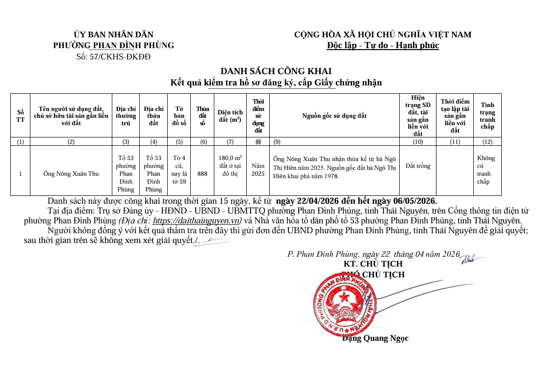 DANH SÁCH CÔNG KHAI Kết quả kiểm tra hồ sơ đăng ký, cấp Giấy chứng nhận ông Nông Xuân Thu thửa đất 888