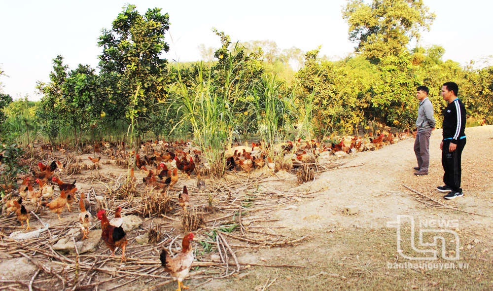 Năm nay, cơ sở chăn nuôi gà đồi của gia đình anh Nguyễn Đắc Phúc (bên phải), ở xóm Bạch Thạch, xã Tân Kim (Phú Bình) nhập 6.000 con gà giống về nuôi để bán vào dịp Tết Nguyên đán.
