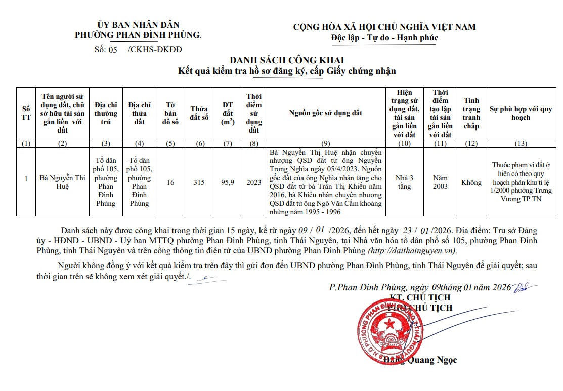 Thông báo về việc tháo dỡ, di chuyển tài sản trên khu đất thu hồi của công ty Cổ phần Trung Tín, phường Phan Đình Phùng, tỉnh Thái Nguyên