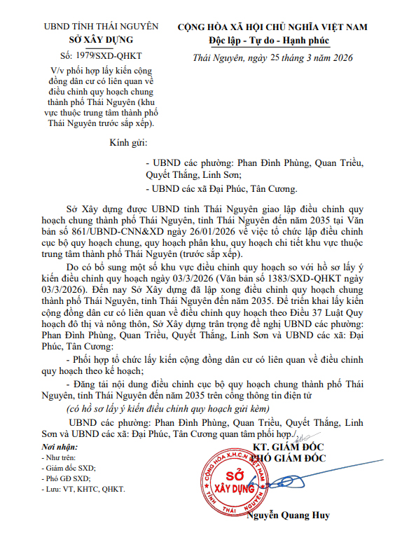 Phối hợp lấy kiến cộng đồng dân cư có liên quan về điều chỉnh quy hoạch chung thành phố Thái Nguyên (khu vực thuộc trung tâm thành phố Thái Nguyên trước sắp xếp)
