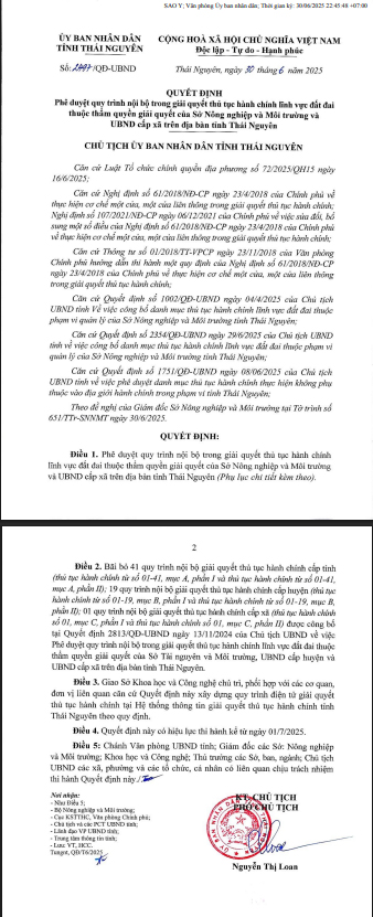 Quyết định phê duyệt nội bộ trong giải quyết thủ tục hành chính lĩnh vực đất đai thuộc thẩm quyền giải quyết của Sở Nông nghiệp và Môi trường và UBND cấp xã trên địa bàn tỉnh Thái Nguyên