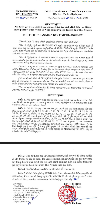 Quyết định phê duyệt quy định nội bộ trong giải quyết thủ tục hành chính lĩnh vực đất đai thuộc phạm vị quản lý của Sở Nông nghiệp và Môi trường tỉnh Thái Nguyên