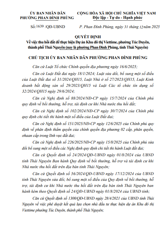 Quyết định thu hồi đất để thực hiện Dự án Khu đô thị Viettime, phường Túc Duyên, thành phố Thái Nguyên (nay là phường Phan Đình Phùng, tỉnh Thái Nguyên)(Vũ Văn Nha)