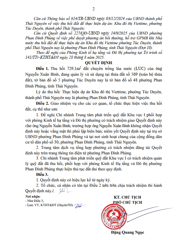 Quyết định về việc thu hồi đất để thực hiện dự án: Khu đô thị Viettime, phường Túc Duyên thành phố Thái Nguyên nay là phường Phan Đình Phùng, tỉnh Thái Nguyên (đợt 10)