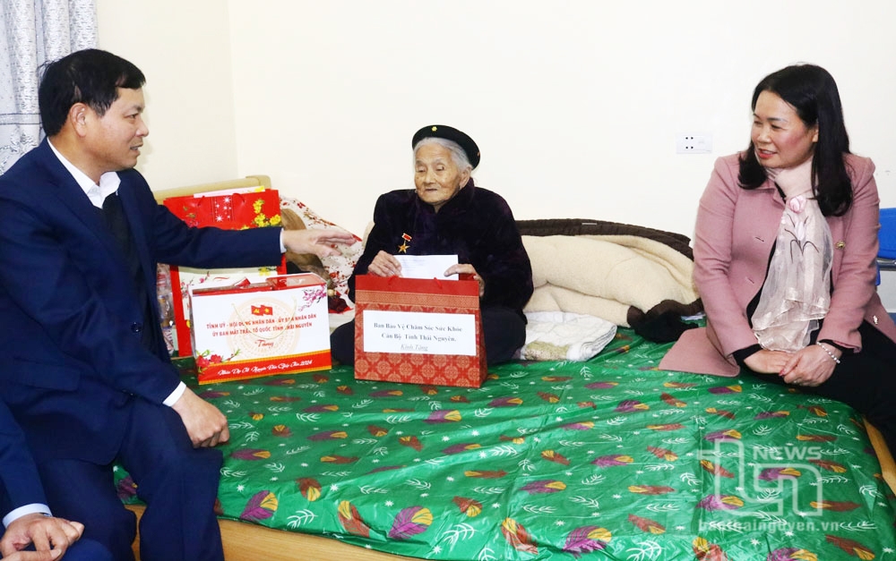 Đồng chí Trưởng Ban Tổ chức Tỉnh ủy Dương Xuân Hùng trao tặng quà Tết của tỉnh và thăm hỏi Mẹ Việt Nam Anh hùng Dương Thị Năng, ở tổ dân phố Quang Vinh, phường Châu Sơn.