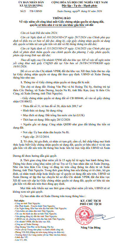 Thông báo công khai mất giấy CNQSD đất của ông Hoàng Văn Phủ