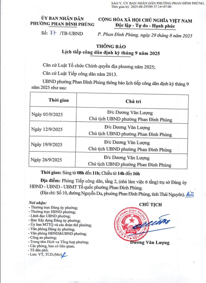 Thông báo: Lịch tiếp công dân định kỳ tháng 9 năm 2025