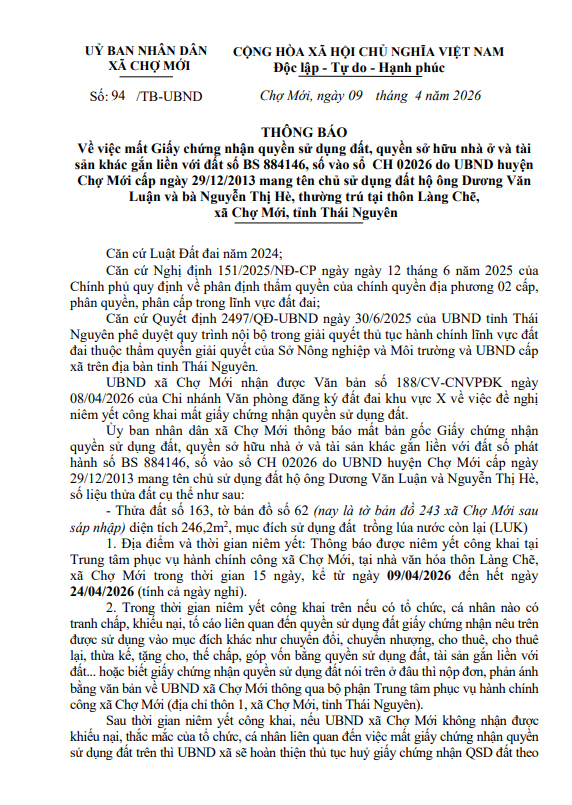 Thông báo nêm yết mất GCNQSDĐ ông Luận Làng Chẽ