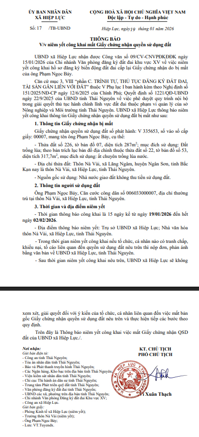 Thông báo niêm yết công khai mất Giấy chứng nhận quyền sử dụng đất