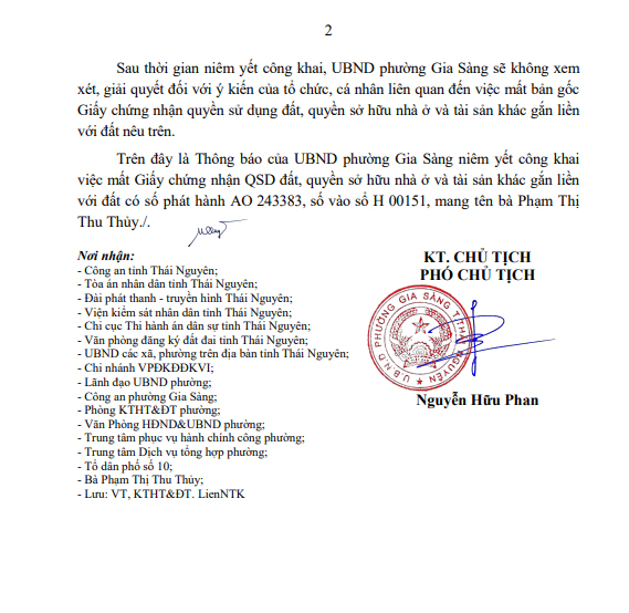 THÔNG BÁO Niêm yết công khai về việc mất Giấy chứng nhận quyền sử dụng đất, quyền sở hữu nhà ở và tài sản khác gắn liền với đất của bà Phạm Thị Thu Thủy, Tổ dân phố số 10, phường Gia Sàng