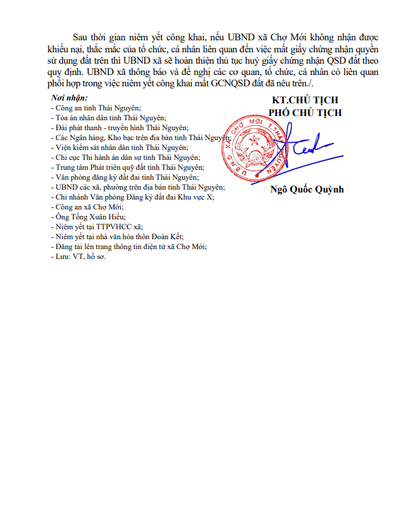 Thông báo nêm yết mất GCNQSDĐ ông Luận Làng Chẽ