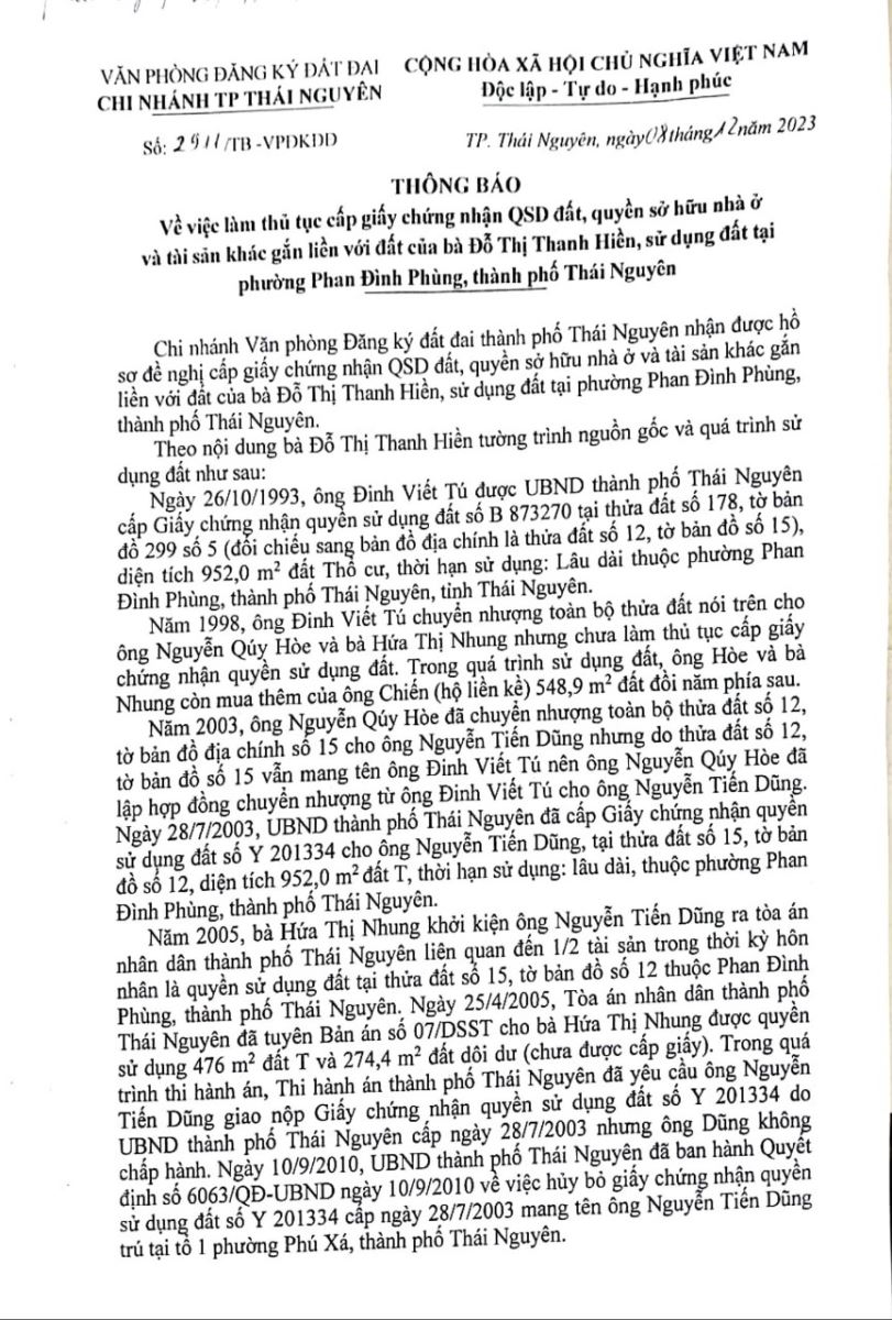 Thông báo về việc cấp giấy chứng nhận QSD đất, quyền sở hữu nhà ở và tài sản khác gắn liền với đất của bà Đỗ Thanh Hiền, sử dụng đất tại phường Phan Đình Phùng, thành phố Thái Nguyên
