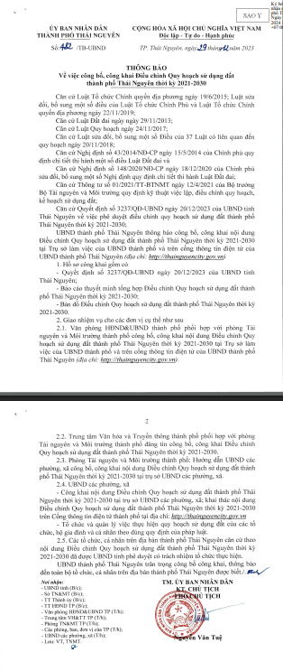 THÔNG BÁO Về việc công bố, công khai Điều chỉnh Quy hoạch sử dụng đất thành phố Thái Nguyên thời kỳ 2021-2030