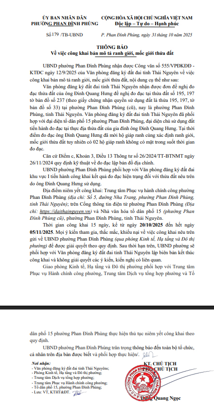 Thông báo Về việc công khai bản mô tả ranh giới, mốc giới thửa đất