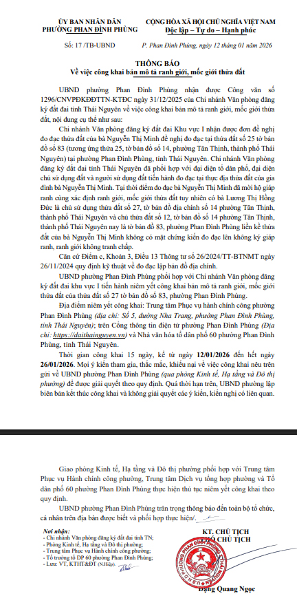 Thông báo Về việc công khai bản mô tả ranh giới, mốc giới thửa đất bà Nguyễn Thị Minh tổ 60, phường Phan Đình Phùng