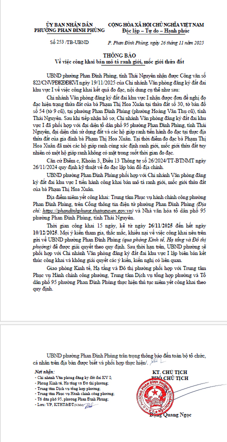 THÔNG BÁO Về việc công khai bản mô tả ranh giới, mốc giới thửa đất (của bà Phạm Thị Hoa Xuân)