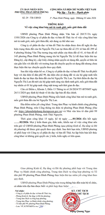 THÔNG BÁO Về việc công khai bản mô tả ranh giới, mốc giới thửa đất Nguyễn Thị Lan