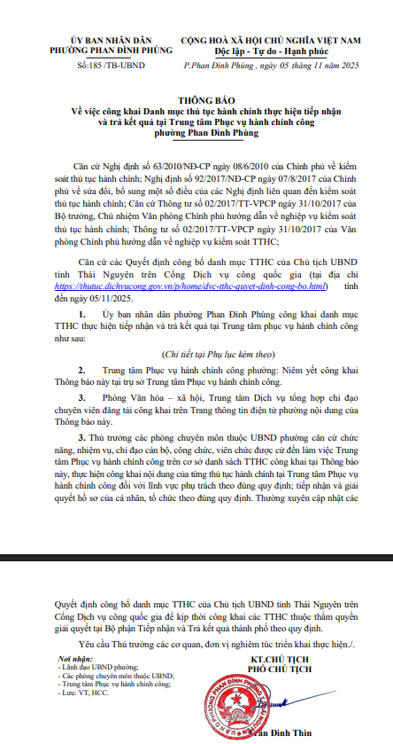 THÔNG BÁO: Về việc công khai Danh mục thủ tục hành chính thực hiện tiếp nhận và trả kết quả tại Trung tâm Phục vụ hành chính công phường Phan Đình Phùng