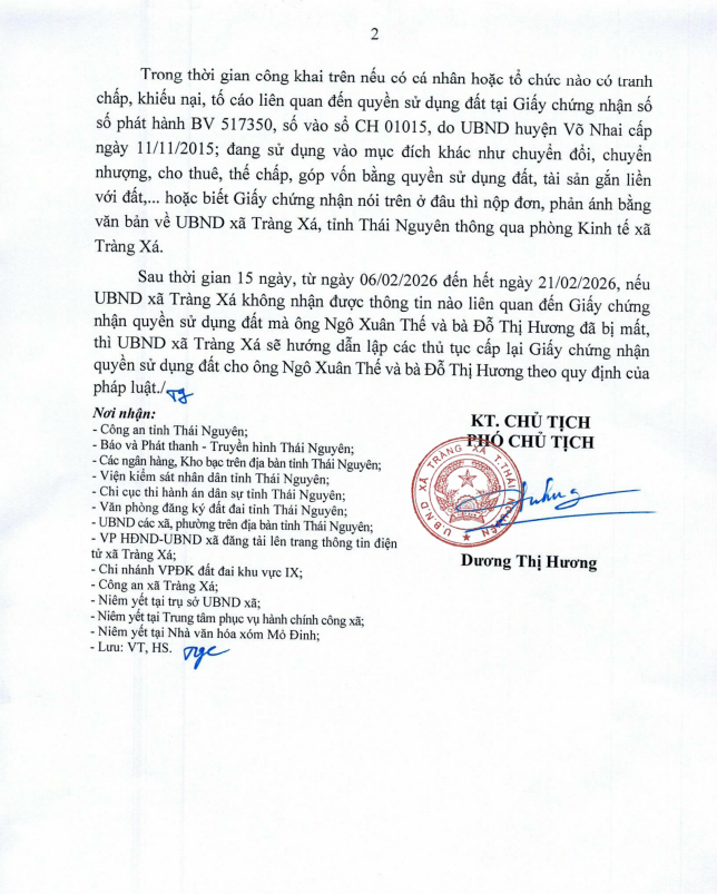 THÔNG BÁO về việc công khai mất Giấy chứng nhận quyền sử dụng đất của ông Ngô Xuân Thế và Đỗ Thị Hương, địa chỉ xóm Mỏ Đinh, xã Tràng Xá, tỉnh Thái Nguyên