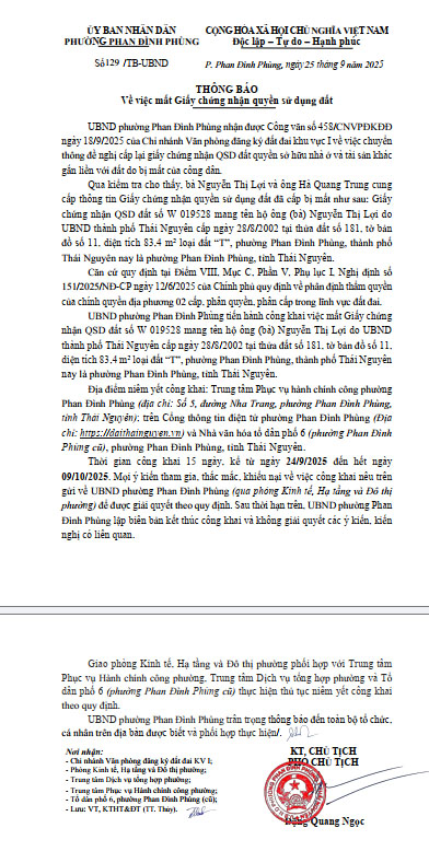 Thông báo Về việc mất Giấy chứng nhận quyền sử dụng đất