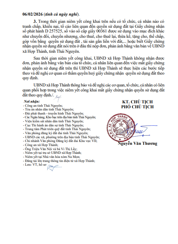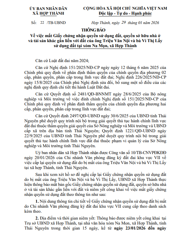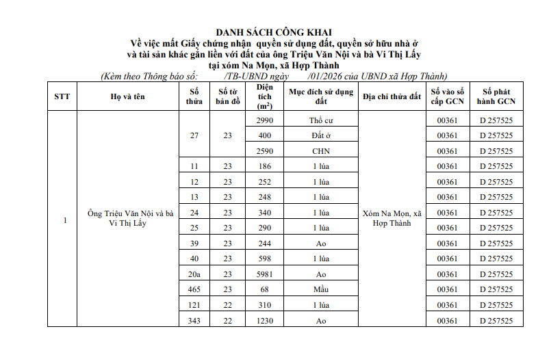 Thông báo về việc mất Giấy chứng nhận quyền sử dụng đất, quyền sở hữu nhà ở và tài sản khác gắn liền với đất của ông Triệu Văn Nội và bà Vi Thị Lấy sử dụng đất tại xóm Na Mọn, xã Hợp Thành