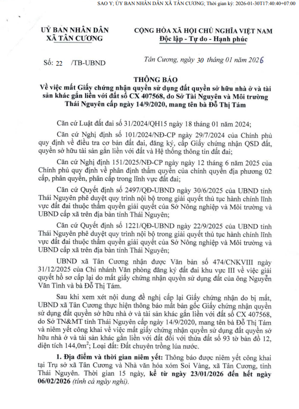 THÔNG BÁO Niêm yết công khai về việc mất Giấy chứng nhận quyền sử dụng đất, quyền sở hữu nhà ở và tài sản khác gắn liền với đất của ông Dương Văn Trình và bà Nguyễn Thị Quỳnh Hương, Tổ dân phố số 10, phường Gia Sàng 27/01/2026 09:46