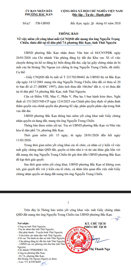 THÔNG BÁO Về việc niêm yết công khai mất GCNQSD đất mang tên ông Nguyễn Trọng Chiến, thửa đất tại tổ dân phố 7A phường Bắc Kạn, tỉnh Thái Nguyên