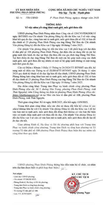 Thông báo về việc niêm yết công khai ranh giới, mốc giới thửa đất