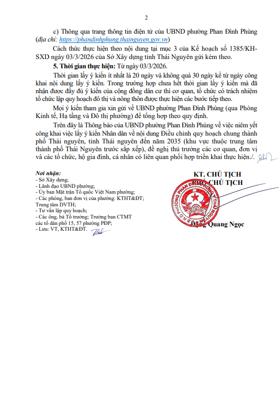 THÔNG BÁO về việc niêm yết công khai việc lấy ý kiến Nhân dân về nội dung Điều chỉnh quy hoạch chung thành phố Thái nguyên, tỉnh Thái nguyên đến năm 2035